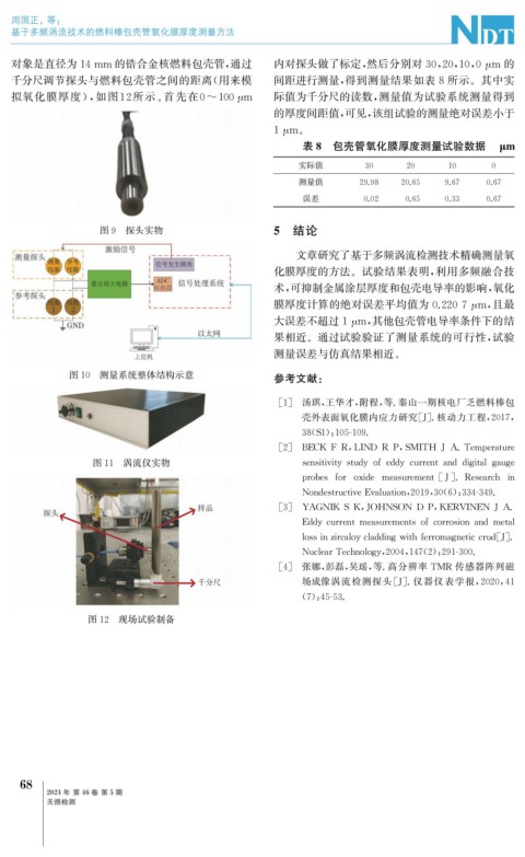 对象是直径为14mm 的锆合金核燃料包壳管, 通过 内对探头做了标定, 然后分别对30 , 20 , 10 , 0 μ m 的