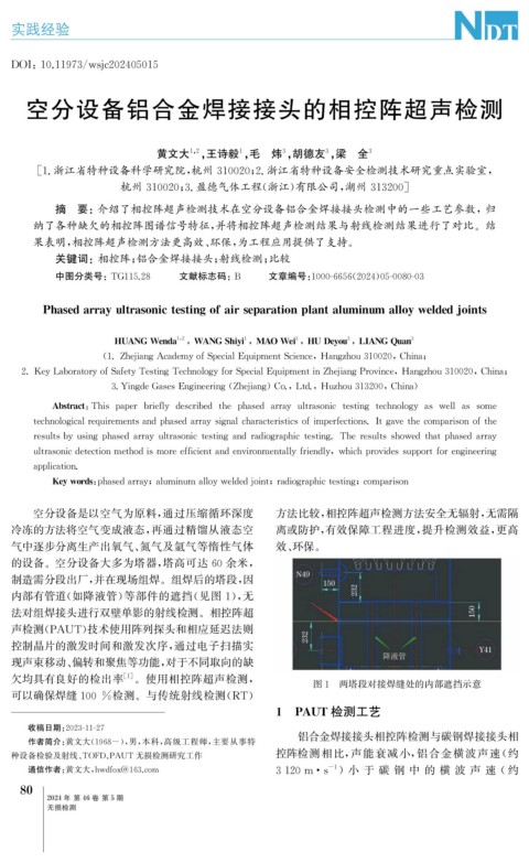 摘 要: 介绍了相控阵超声检测技术在空分设备铝合金焊接接头检测中的一些工艺参数,归