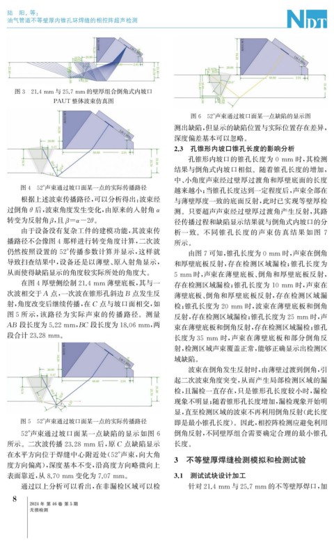 仍然按照设置的 52° 传播参数计算并显示, 这样就 由图7可知, 锥孔长度为0mm 时, 声束在倒角