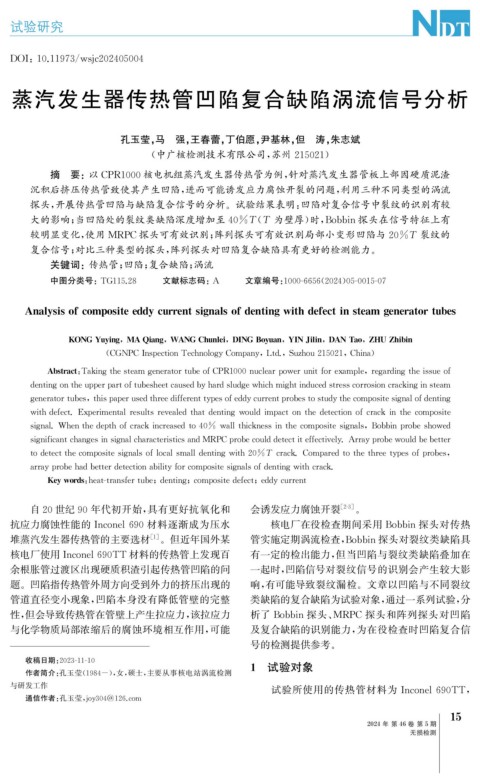 核电厂使用Inconel690TT 材料的传热管上发现百 有一定的检出能力, 但当凹陷与裂纹类缺陷叠加在