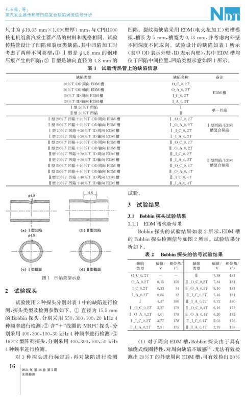 传热管设计了凹陷和裂纹类缺陷, 其中凹陷加工时 不同深度不同取向。试验设计的缺陷如表 1 所示