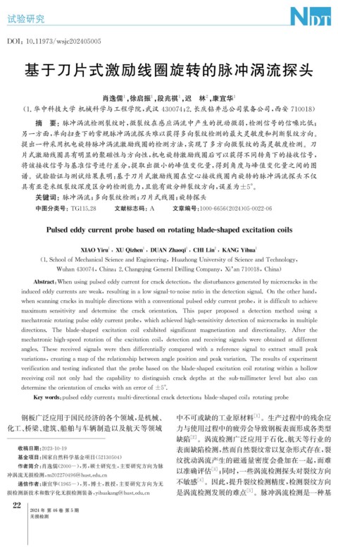 关键词: 脉冲涡流; 多向裂纹检测; 刀片式线圈; 旋转探头
