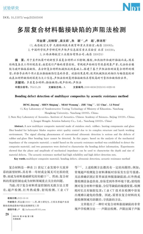 关键词: 多层复合材料; 黏接缺陷; 超声检测; 声阻法