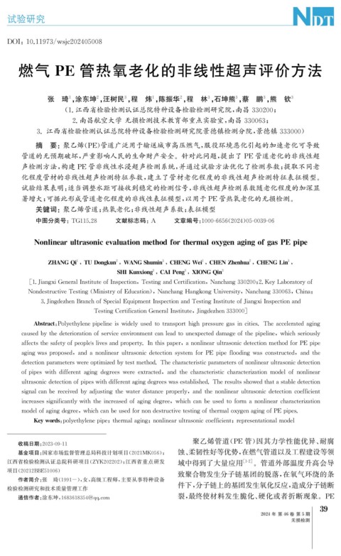 著增大; 可据此形成管道老化程度的非线性表征模型, 以用于 PE 管热氧老化的无损检测。
