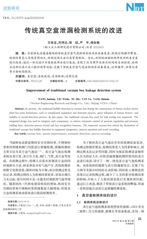 Abstract : At p resent , thetraditionalbubbledetectioninvacuumboxdurin g theconstructionofformernuclear p ower