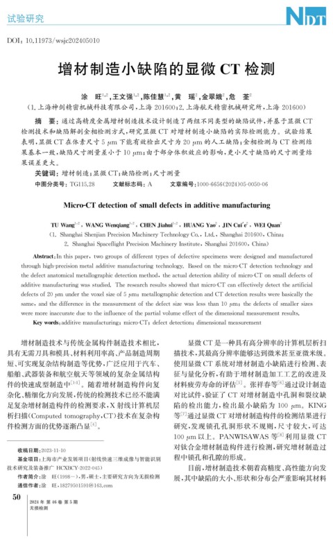 摘 要: 通过高精度金属增材制造技术设计制造了两组不同类型的缺陷试件, 并基于显微 CT