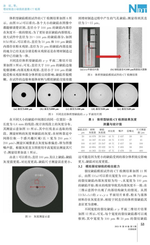 体积型缺陷模拟试件的 CT 检测结果如图8所 到增材制造过程中产生的气孔缺陷, 测量得到其直