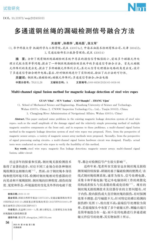 了多通道信号融合硬件电路; 最后, 针对钢丝绳进行了实际测试, 验证了此方法的可行性。