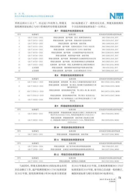 损检测国家标准已与对口管理的所有焊缝无损检测 个方法的国家标准如表7~12所示。