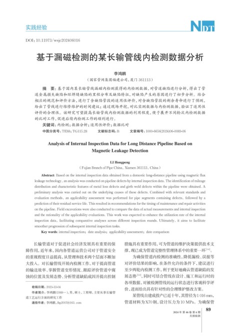 Abstract: Based on the internal inspection data obtained from a domestic long-distance pipeline using magnetic flux