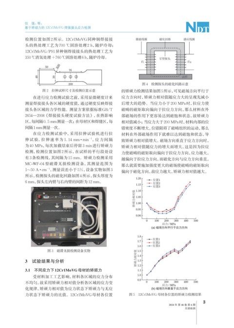 检测,检测位置如图 2 所示,在试样的平行段处设 力使磁畴的磁矩取向偏向于拉应力方向,应力越大,