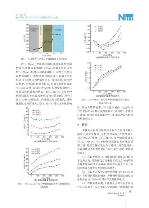 图 11(a) 和 (b) 中位置 1 的矫顽力相对值最大,说明 图 11 12Cr1MoVG/P91 异种钢焊接接头各位置的
