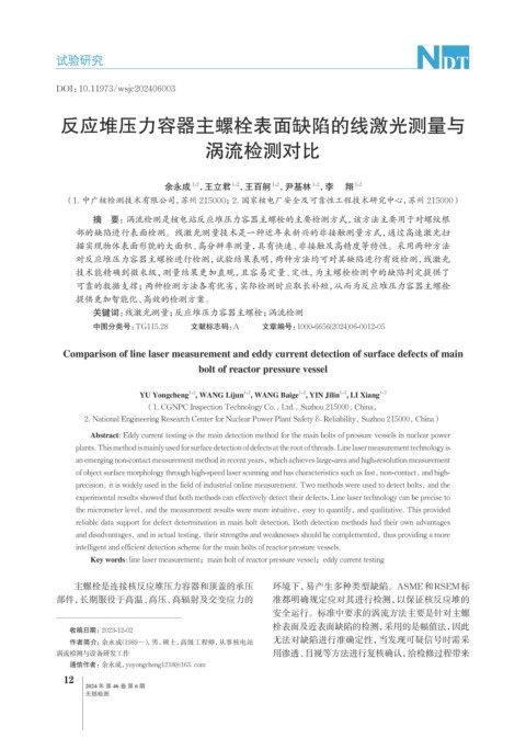 关键词:线激光测量;反应堆压力容器主螺栓;涡流检测
