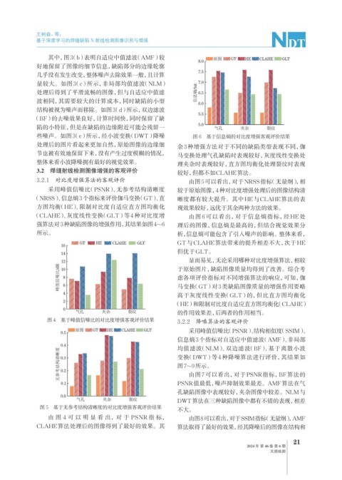 (NRSS)、信息熵3个指标来评价伽马变换 (GT)、直 晰度都有较大提升。其中HE与CLAHE算法的表
