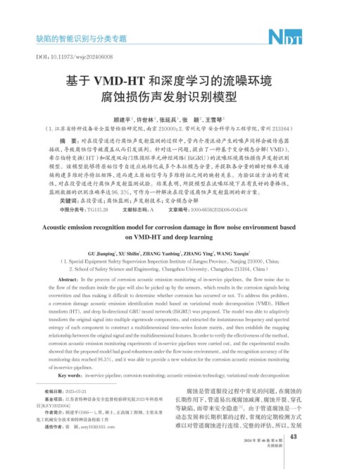 Key words:in-service pipeline; corrosion monitoring; acoustic emission technology; variational mode decomposition
