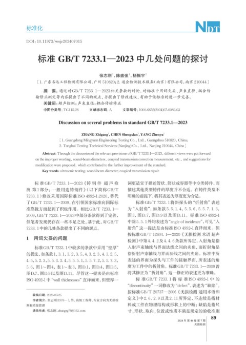 摘 要:通过对GB/T 7233. 1—2023相关条款的讨论,对标准中用词欠妥、声束直径、耦合传