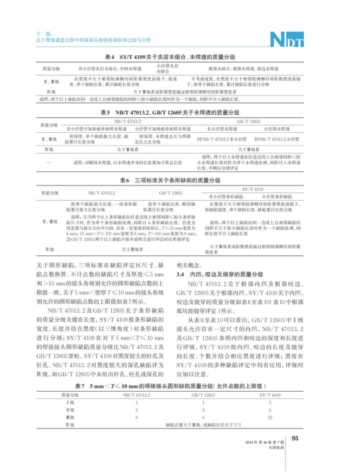 的焊接接头圆形缺陷质量分级比NB/T 47013. 2及 行评级,SY/T 4109 按内凹、咬边的长度及烧穿