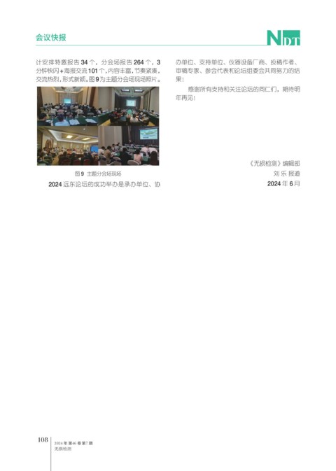 会议快报 计安排特邀报告 34 个,分会场报告 264 个,3 办单位、支持单位、仪器设备厂商、投稿作者、 分钟快闪+海报交流101个,内容丰富,节奏紧凑, 审稿专家、参会代表和论坛组委会共同努力的结 交流热烈,形式新颖。图9 为主题分会场现场照片。 果! 感谢所有支持和关注论坛的同仁们,期待明 年再见! 《无损检测》编辑部 图 9 主题分会场现场 刘 乐 报道 2024 远东论坛的成功举办是承办单位、协 2024 年 6 月 108 2024 年 第46 卷 第7 期 无损检测