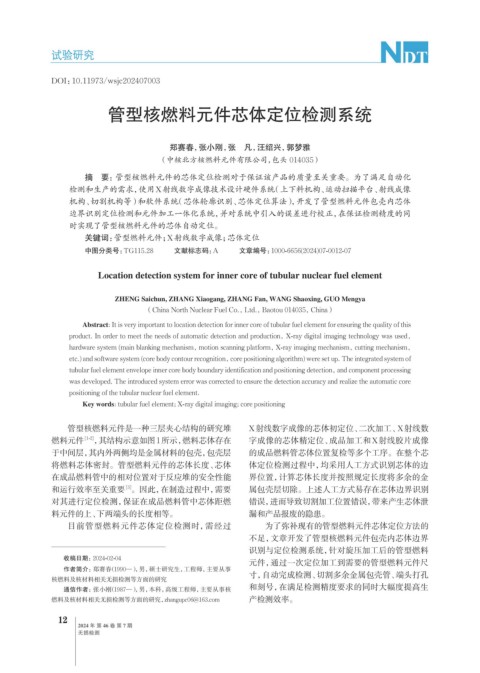 关键词:管型燃料元件;X射线数字成像;芯体定位