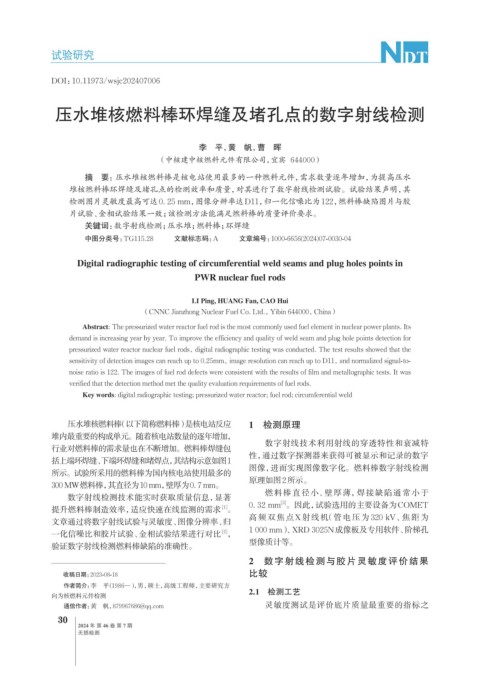 Key words: digital radiographic testing; pressurized water reactor; fuel rod; circumferential weld