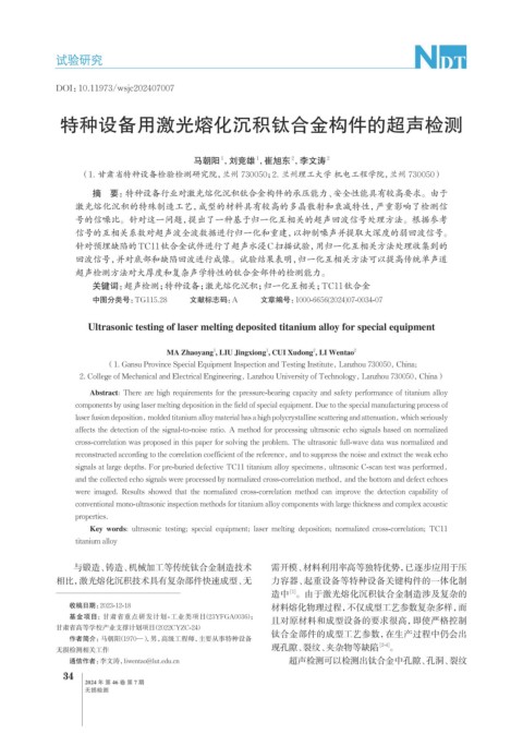 通信作者:李文涛,liwentao@lut.edu.cn 超声检测可以检测出钛合金中孔隙、孔洞、裂纹