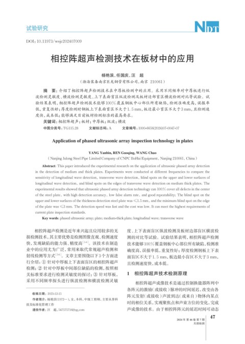 相控阵超声检测是近年来兴起且应用较多的无 度、上下表面盲区纵波检测及板材边部盲区横波检