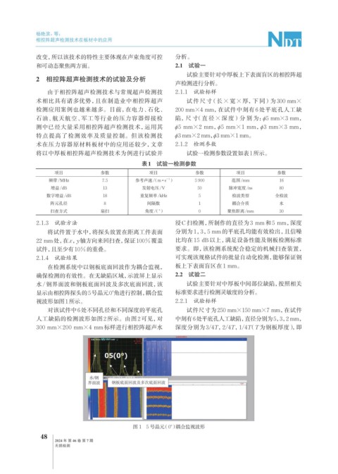 将以中厚板相控阵超声检测技术为例进行试验并 试验一检测参数设置如表1所示。