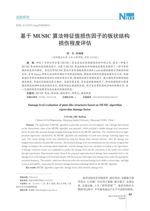 Abstract: The application of MUSIC algorithm in plate-like structures was investigated, and a damage factor based