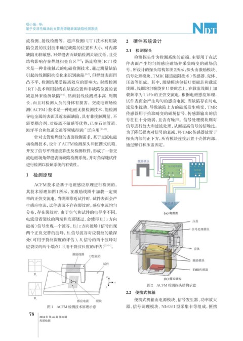 图 1 ACFM 检测技术原理示意 器、信号调理模块、NI-6361型采集卡等组成,便携