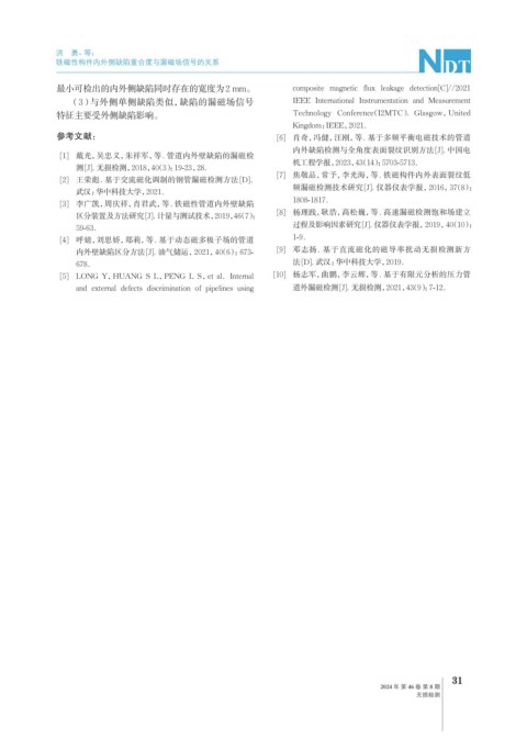 最小可检出的内外侧缺陷同时存在的宽度为2 mm。 composite magnetic flux leakage detection[C]//2021