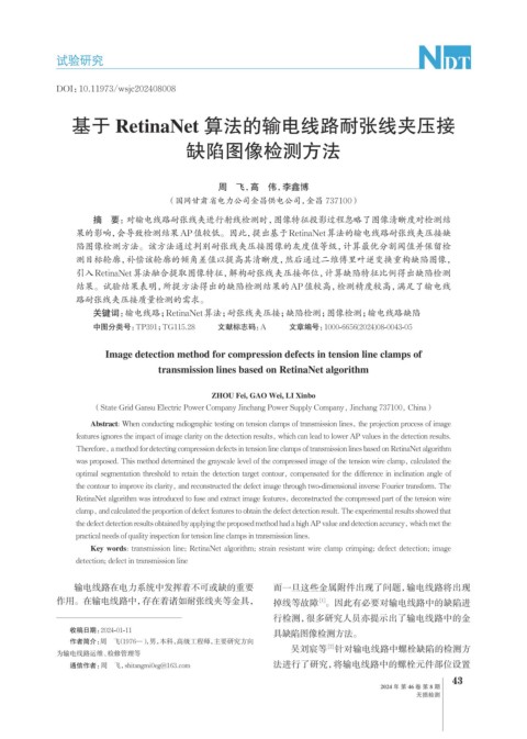 关键词:输电线路;RetinaNet算法;耐张线夹压接;缺陷检测;图像检测;输电线路缺陷