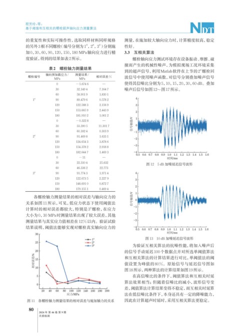 图 11 各螺栓轴力测量结果的相对误差与施加轴力的关系 因此在计算超声时延时,采用互相关算法更稳定。