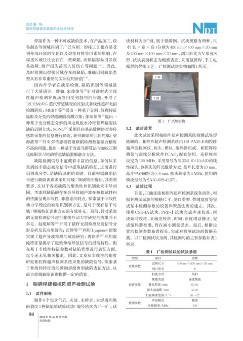 实现了超声导波检测的试验研究;唐铭希 [14] 利用混 集。以1 检测试块为例,其检测时的主要参数如表1