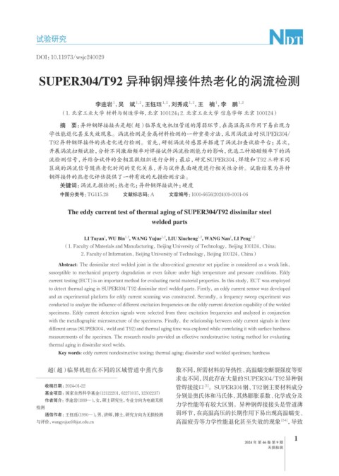 关键词:涡流无损检测;热老化;异种钢焊接试件;硬度