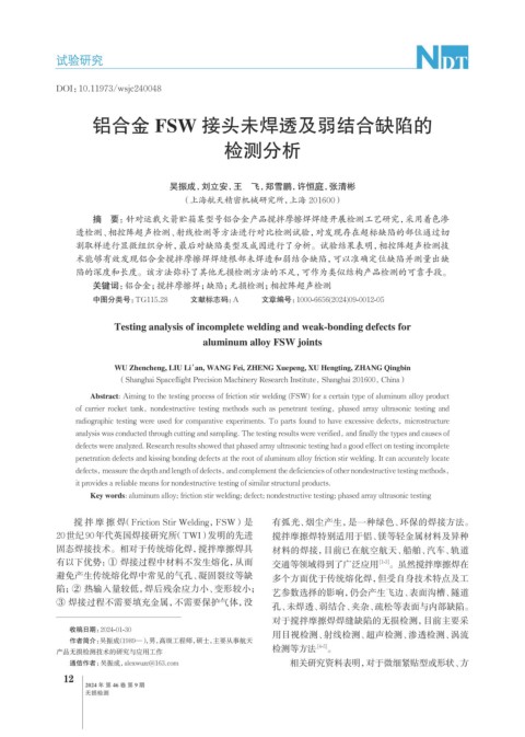 Key words: aluminum alloy; friction stir welding; defect; nondestructive testing; phased array ultrasonic testing