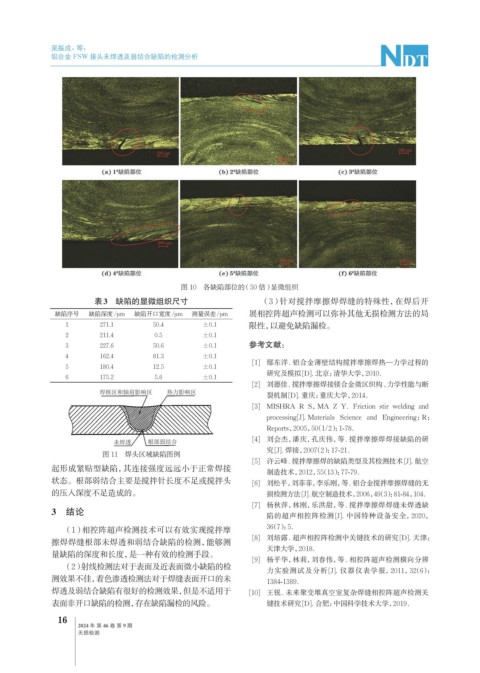 表3 缺陷的显微组织尺寸 (3)针对搅拌摩擦焊焊缝的特殊性,在焊后开