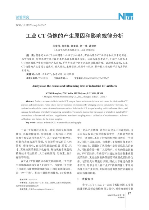 工业 CT 检测技术作为一种先进的无损检测 质上更易产生伪像,甚至可以说是不可避免的,这