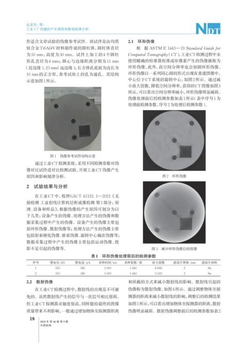 10 mm的正方形,参考试块上的孔为通孔。其结构 环形伪像以一系列同心圆的形式出现在重建图像中,