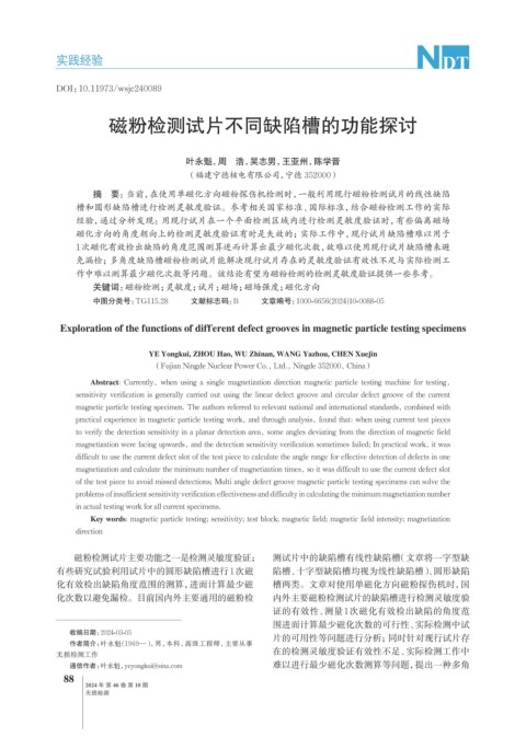 Key words: magnetic particle testing; sensitivity; test block; magnetic field; magnetic field intensity; magnetization
