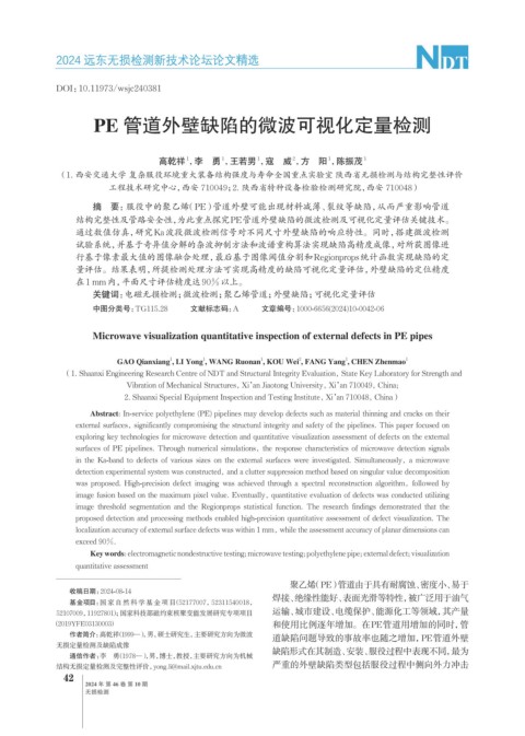 关键词:电磁无损检测;微波检测;聚乙烯管道;外壁缺陷;可视化定量评估