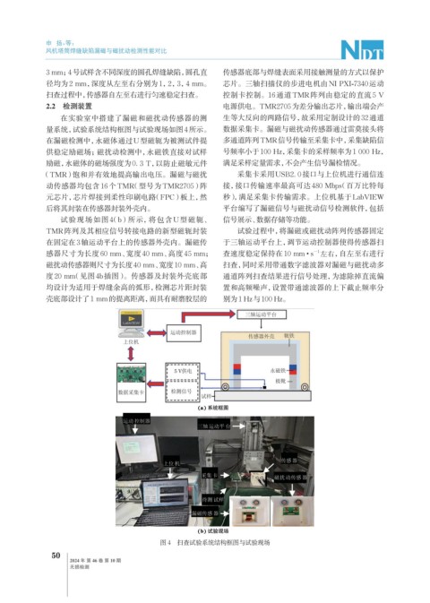 量系统,试验系统结构框图与试验现场如图4所示。 数据采集卡。漏磁与磁扰动传感器通过雷莫接头将