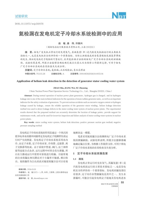 Key words: stator cooling water system; helium leak detection; positive pressure suction gun method; negative