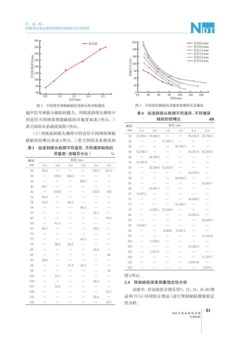 超声信号和最小缺陷的能力。用纵波斜探头测得不 表4 纵波斜探头检测不同直径、不同埋深