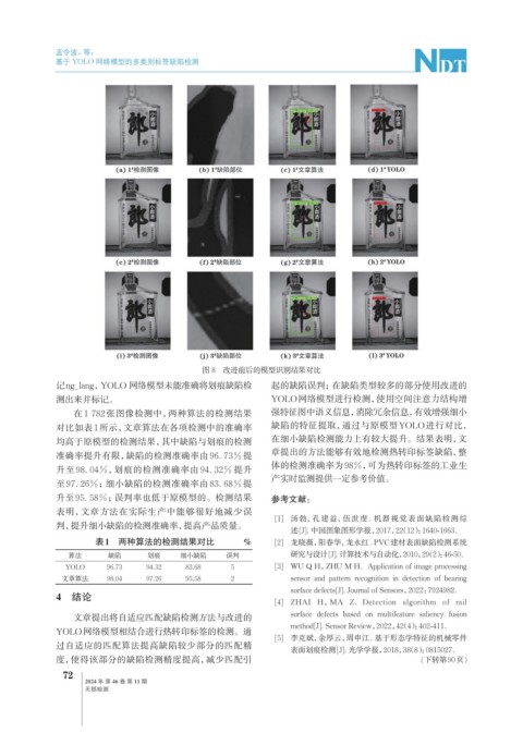 准确率提升有限,缺陷的检测准确率由 96. 73%提 章提出的方法能够有效地检测热转印标签缺陷,整