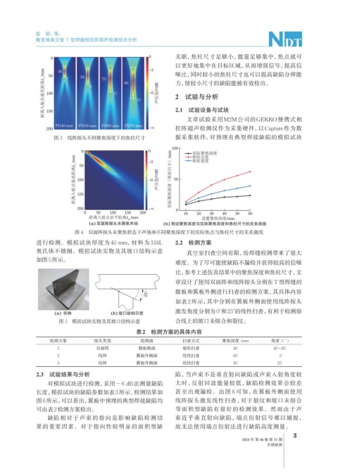 图 3 线阵探头不同聚焦深度下的焦柱尺寸 据采集软件,对预埋有典型焊接缺陷的模拟试块