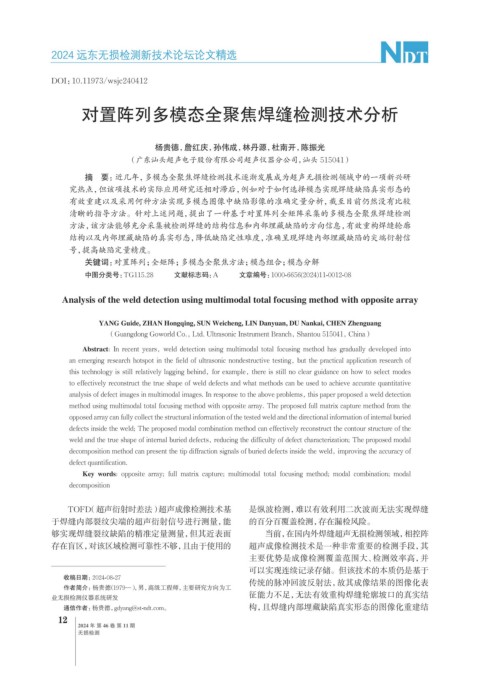 清晰的指导方法。针对上述问题,提出了一种基于对置阵列全矩阵采集的多模态全聚焦焊缝检测
