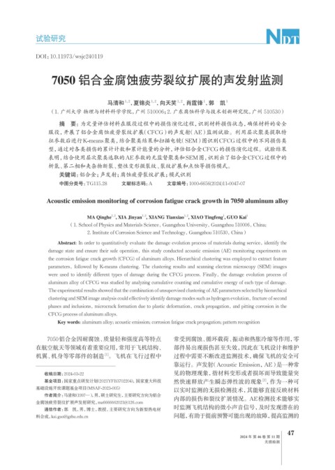 关键词:铝合金;声发射;腐蚀疲劳裂纹扩展;模式识别