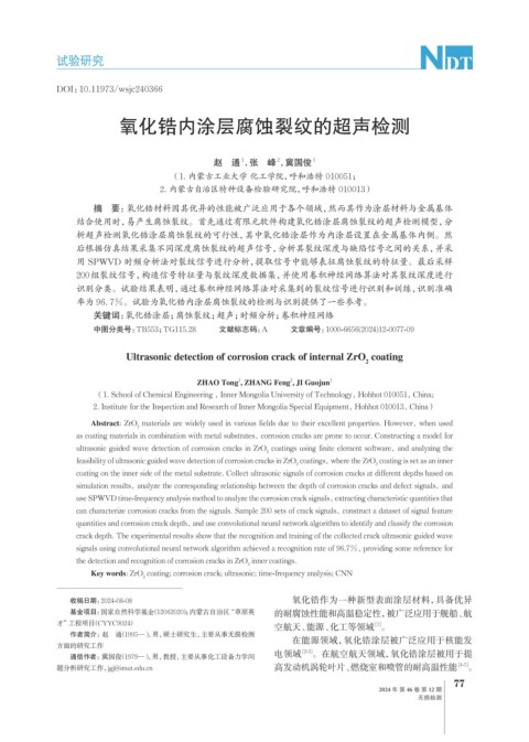 Key words: ZrO coating; corrosion crack; ultrasonic; time-frequency analysis; CNN