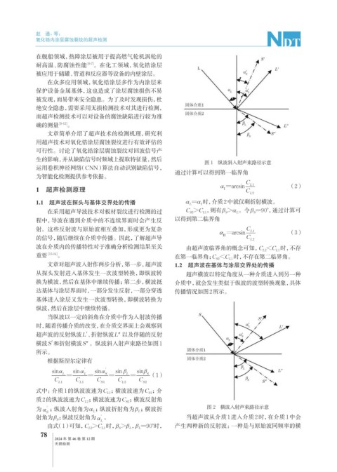 从探头发射进入基体发生一次波型转换,即纵波转 超声横波以特定角度从一种介质进入到另一种