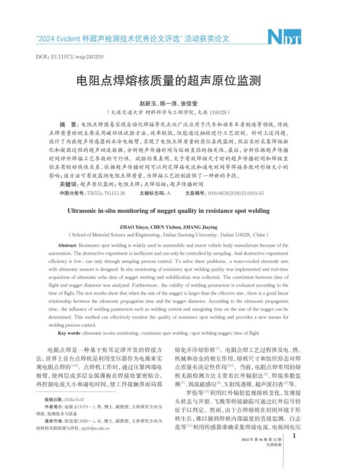 关键词:超声原位监测;电阻点焊;点焊熔核;超声传播时间